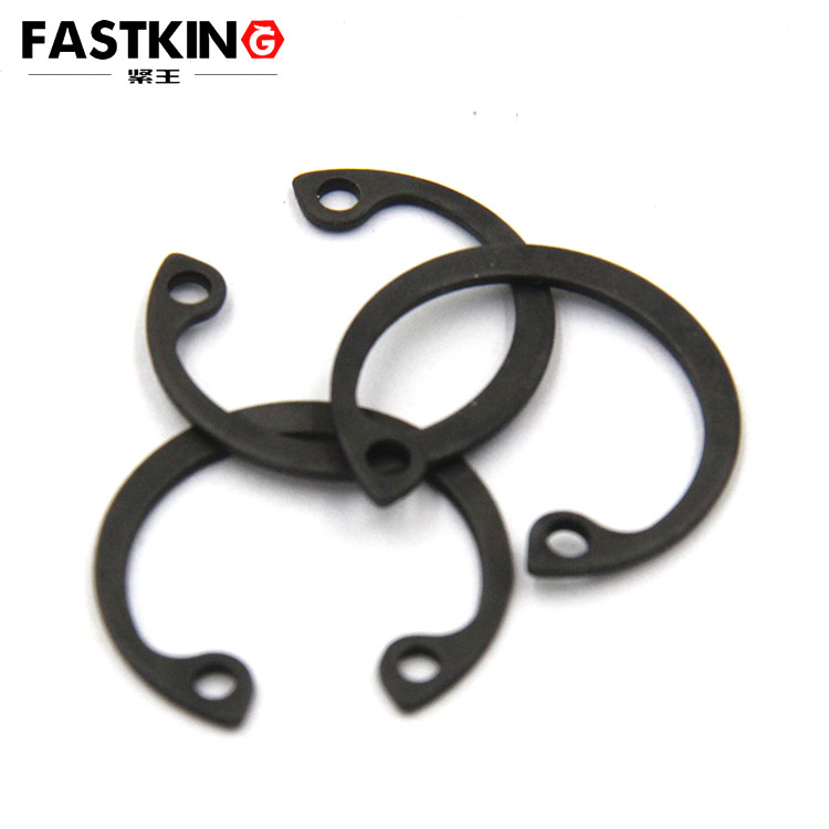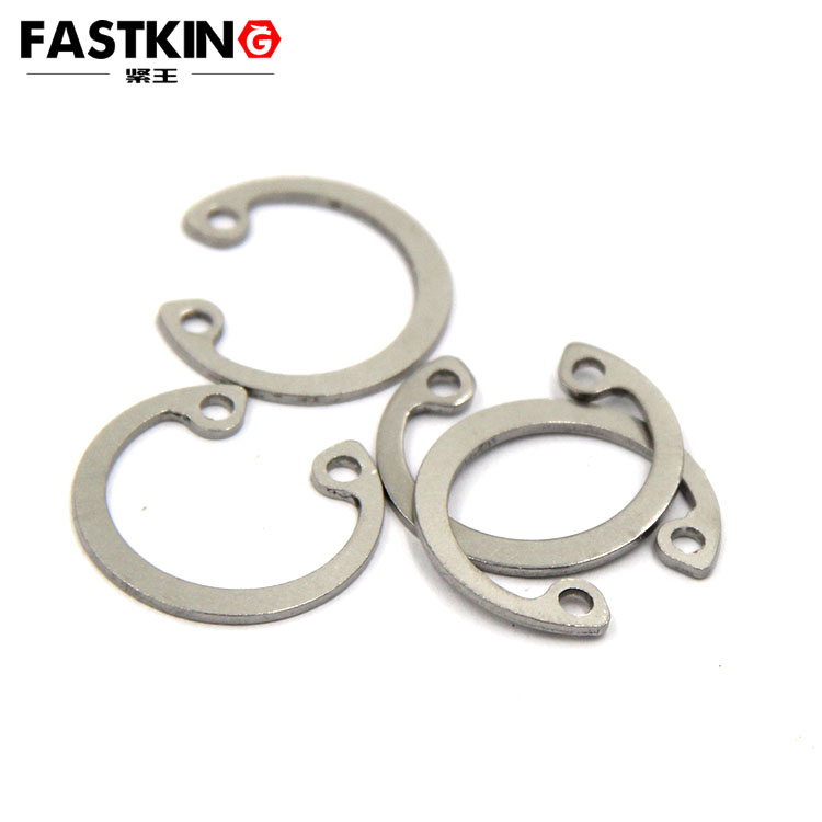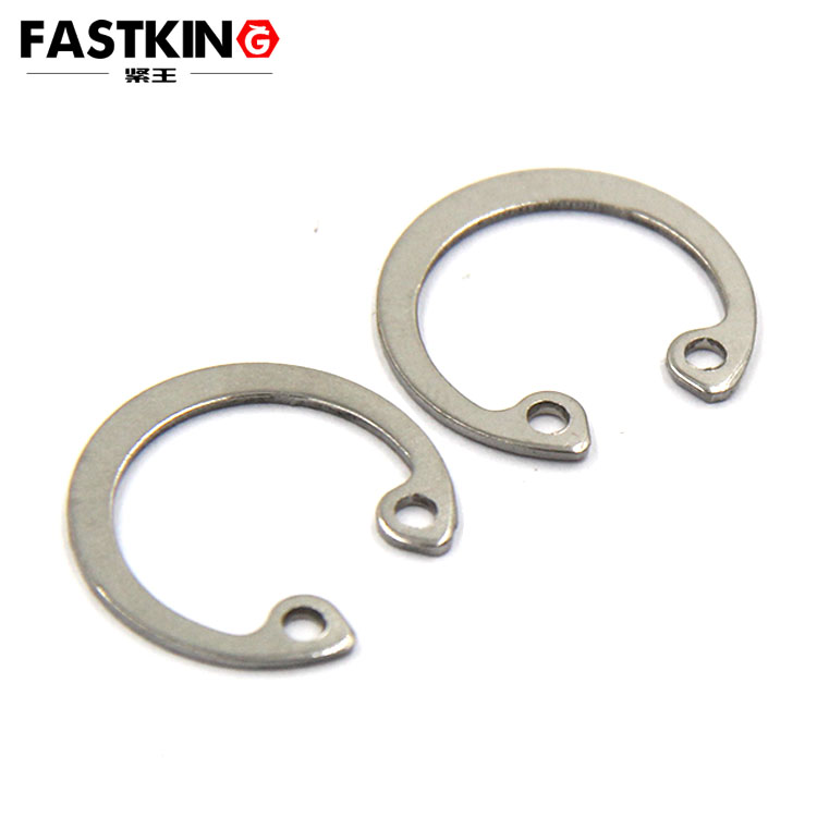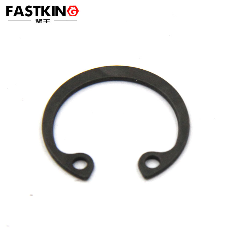 孔用彈性擋圈,安裝于圓孔內(nèi),用作固定零部件的軸向運(yùn)動(dòng),這類(lèi)擋圈的外徑比裝配圓孔直徑稍大。安裝時(shí)須用卡簧鉗,將鉗嘴插入擋圈的鉗孔中,夾緊擋圈,才能放入預(yù)先加工好的圓孔內(nèi)槽。